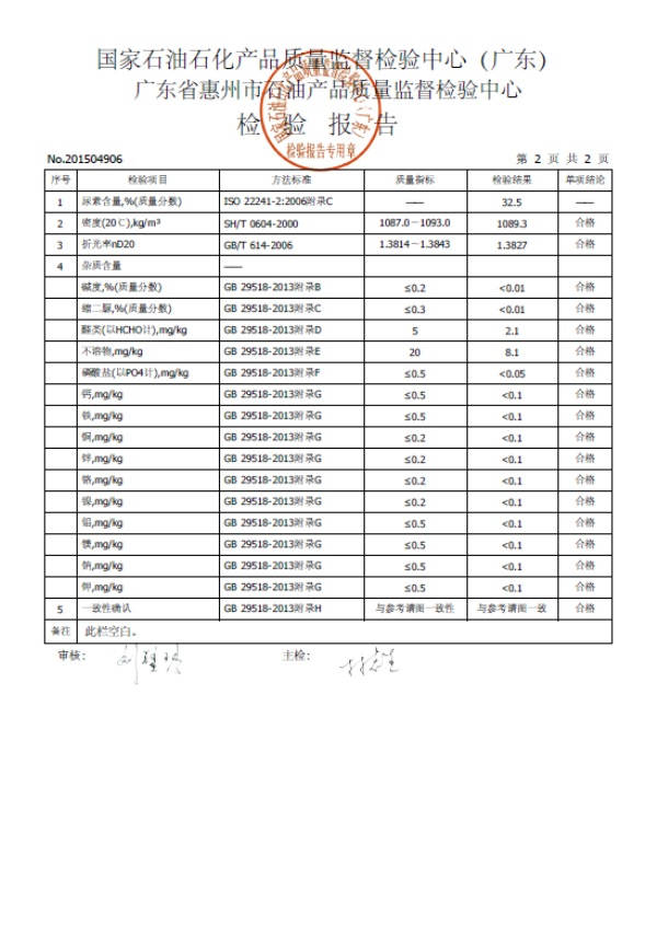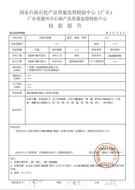 ? ? ? ? 2015年6月1日,我司的“馭藍(lán)柴油尾氣處理液”通過了第三方——國家石油石化產(chǎn)品質(zhì)量監(jiān)督檢驗中心(廣東省惠州市石油產(chǎn)品質(zhì)量監(jiān)督檢驗中心)的檢測,其中多個檢測項目包括:密度、折光度、堿度、縮二脲含量、醛類指標(biāo)、不溶物含量、磷酸鹽含量,檢測出來的指標(biāo)都遠(yuǎn)遠(yuǎn)低于國家規(guī)定標(biāo)準(zhǔn),其他的重金屬鋁、鈣、鉀、鈉、銅、鐵、鎂、鎳、鋅、鉻都均未檢測出來,就連紅外定性也與標(biāo)準(zhǔn)譜圖一致,相關(guān)技術(shù)指標(biāo)均符合國家GB 29518-2013《尿素水溶液》的嚴(yán)格標(biāo)準(zhǔn),最后“馭藍(lán)”順利地拿到了合格的檢測報告。