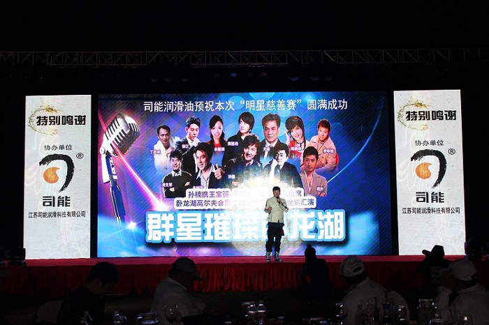 ? ? ? ?2014年12月15日晚,柳州臥龍湖高爾夫俱樂(lè)部隆重舉辦開業(yè)周年慶典暨會(huì)員“明星慈善邀請(qǐng)賽”,孫楠、王寶強(qiáng)、朱時(shí)茂等十幾位明星齊聚柳州臥龍湖。高爾夫賽事、慈善晚宴、文藝匯演,司能潤(rùn)滑油作為協(xié)辦單位傾情傾力,與群星共同呈現(xiàn)了一場(chǎng)璀璨搖曳的視聽饕餮盛宴。