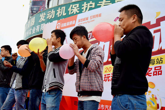 ↑對(duì)年輕的小伙子們來(lái)說(shuō),吹爆氣球可謂小菜一碟啦