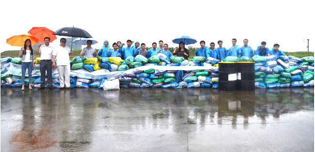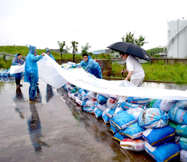? ? ? ? 2016年6月28日中午12時(shí)左右,溧陽地區(qū)連續(xù)強(qiáng)降雨使蕪申運(yùn)河水位由早上8點(diǎn)的4.5米急速上升至5.5米,水面距離公司碼頭駁岸距離不到0.5米。發(fā)現(xiàn)這一情況,司能石化常務(wù)副總經(jīng)理吳土金立即組織和號(hào)召江蘇司能防汛抗洪小組第一時(shí)間緊急啟動(dòng)一系列防汛抗洪應(yīng)急措施: