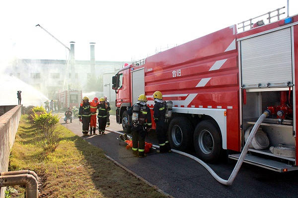 ? ? ? ? 演練現(xiàn)場設(shè)置在司能石油化工有限公司D401原材料儲罐外,演練科目設(shè)置為員工在對儲罐進行補焊作業(yè)時突發(fā)火災(zāi),火災(zāi)現(xiàn)場臨近柴油儲罐,兩名微型消防人員進行自救時受傷、昏迷被困現(xiàn)場。演練按先期應(yīng)急處置,企業(yè)自救和緊急疏散,消防大隊和120急救中心人員現(xiàn)場一起出動應(yīng)急救援,污染排查,總結(jié)等五個環(huán)節(jié)進行。整個演練過程環(huán)環(huán)相扣,有條不紊,各應(yīng)急隊伍、救援隊伍緊密配合,協(xié)同作戰(zhàn),最終成功控制了事故損失的進一步擴大,消除了事故的危害,獲得了圓滿成功。演練歷時約1小時30分,共有95人參加演練,出動消防車6輛,120急救車1輛,以及安監(jiān)、交警、環(huán)保等應(yīng)急救援車輛3部。